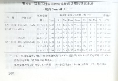對(duì)于含氮的雙相不銹鋼和超級(jí)雙相不銹鋼的填充材料通常用比母材高的鎳和母材相同的含氮量,以保證焊縫金屬有足頓奧氏體量。國(guó)外針對(duì)常用雙相不銹鋼采用的填充金屬牌號(hào)及斯型成分(以瑞典 Sandvik廠為代表)見(jiàn)表6-8,異種鋼焊接采用填充金屬見(jiàn)表6-9。國(guó)內(nèi)大量采用的00018N5M03S2解00Cr22N5Mo3N鋼所用的雙相填充金屬成分和可替代的焊料列于表610,異種鋼焊接采用的填充金屬列于表611